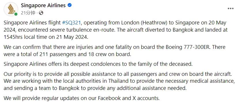 之后,新加坡航空发布声明称,新加坡航空从伦敦飞往新加坡的SQ321航班,在飞行中遭遇严重颠簸,并于当地时间5月21日15:45备降曼谷机场。
