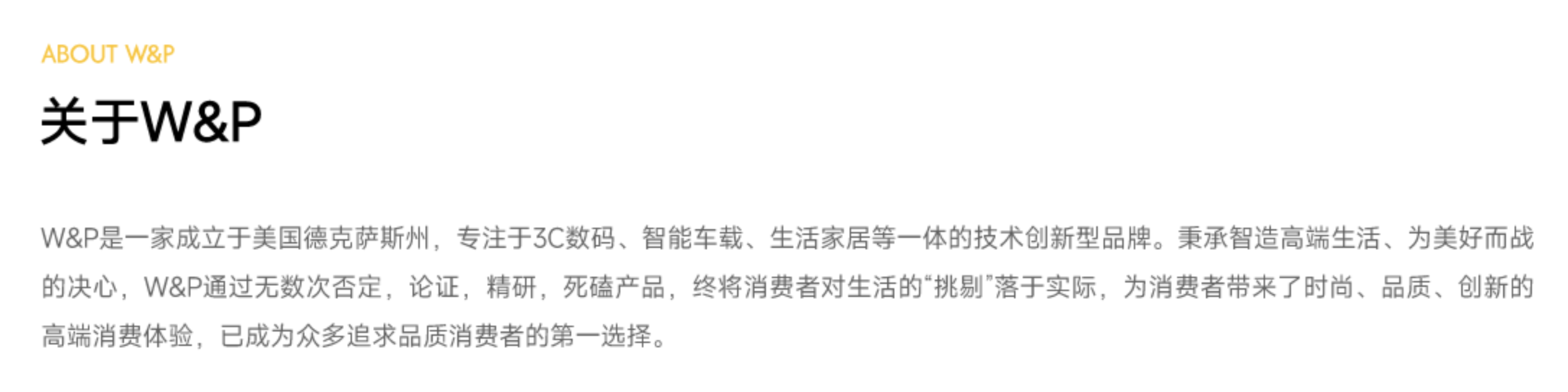 据W&P官网介绍,W&P是一家成立于美国得克萨斯州,专注于3C数码、智能车载、生活家居等一体的技术创新型品牌。