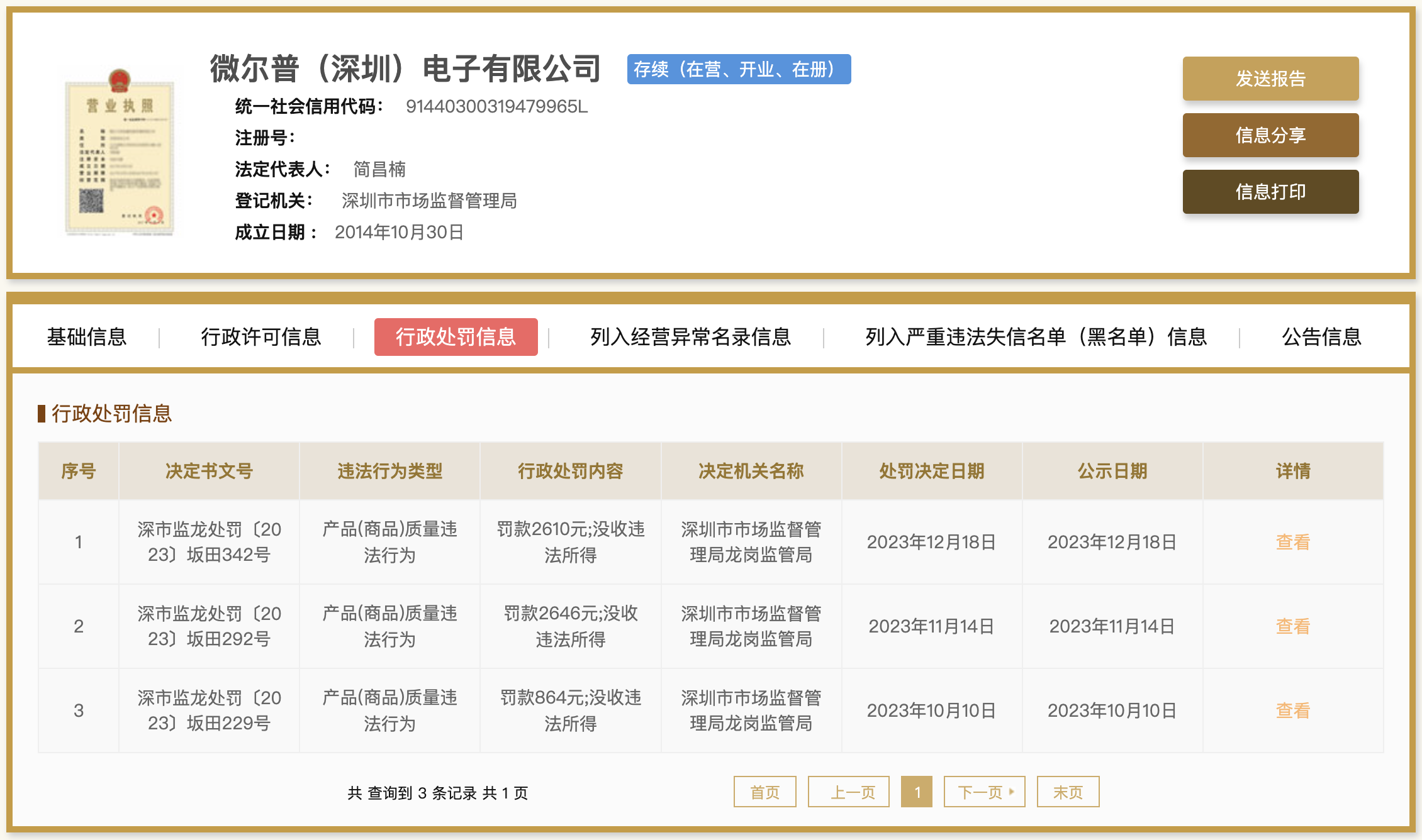 此外,关于产品质量问题也备受消费者关注。在2023年10月到2023年12月期间,微尔普公司因产品(商品)质量违法行为,接连三次被深圳市市场监督管理局龙岗监管局行政处罚。